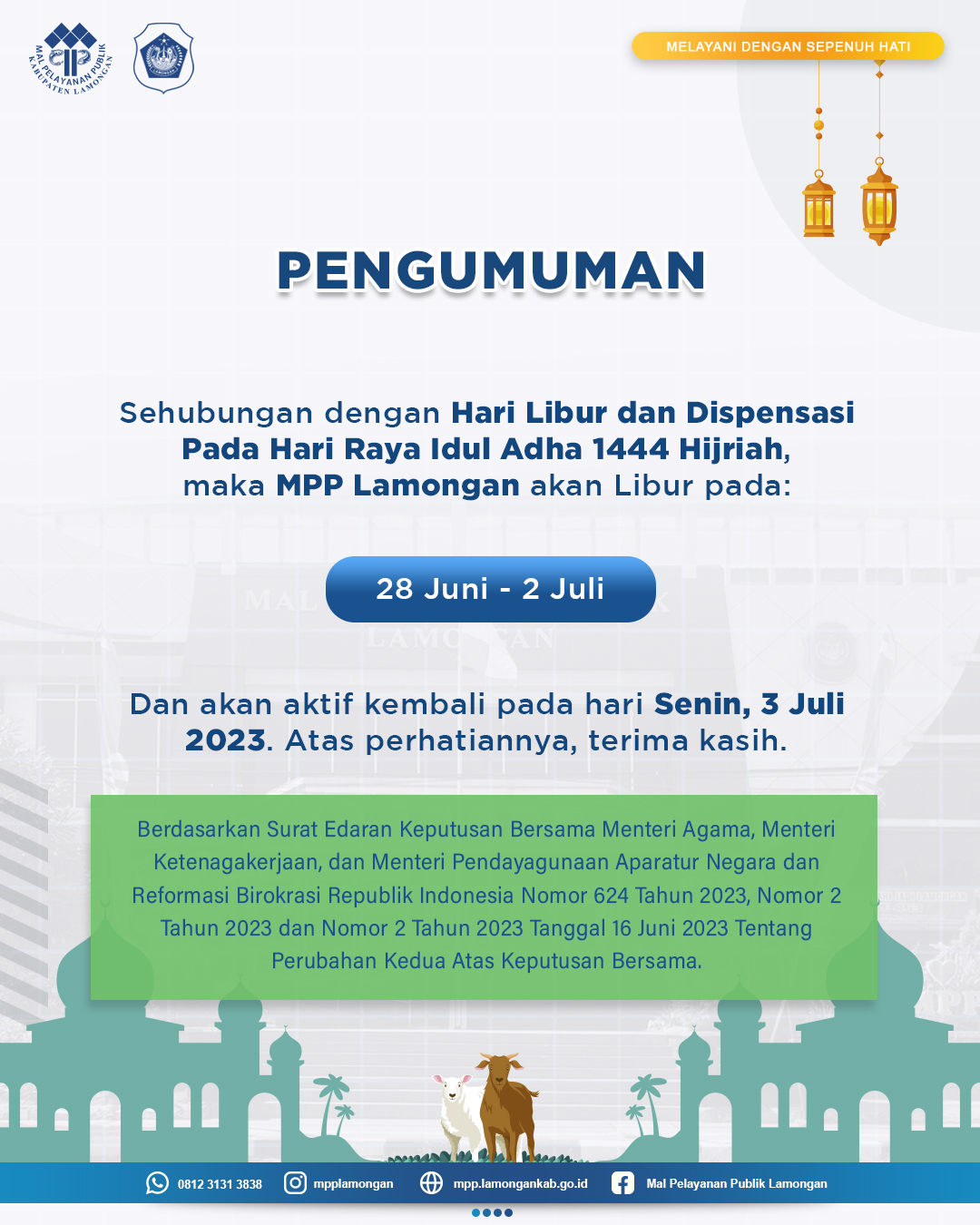 Bahwa pada hari Rabu s/d Jumat, tanggal 28 Juni 2023 s/d 30 Juni 2023 Pelayanan di Mal Pelayanan Publik Kabupaten Lamongan di TUTUP dan di BUKA kembali pada hari Senin, tanggal 3 Juli 2023.