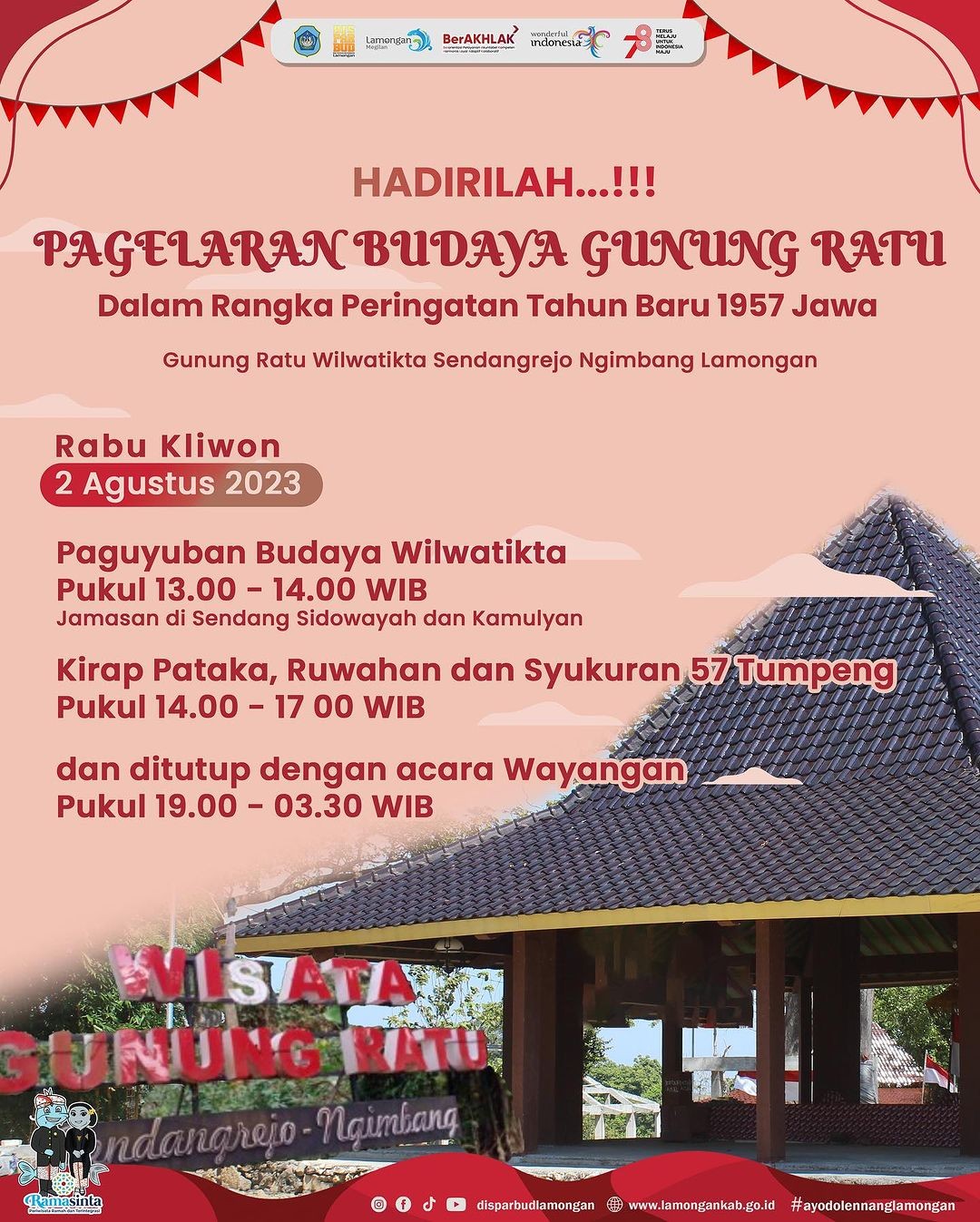 Kirab Budaya Peringatan Tahun Baru Jawa, Refleksi Tingkatkan Imtak untuk memperingati Tahun Baru 1 Suro 1957 (kalender jawa) atau 1 Muharram 1445 (kalender islam), Paguyuban Budaya Wilwatikta menggelar Pagelaran Budaya di Pendopo Wisata Gunung Ratu Desa Sendangrejo Kecamatam Ngimbang yang berlangsung pada hari Rabu 2/8/2023. Beragam kesenian dan tradisi budaya dilakukan mulai dari Jamasan di Sendang Sidowayah dan Kamulyan, Kirab Pataka Paguyuban Wilwatikta, Ruwatan sekaligus Pelantikan Pengurus Paguyuban Budaya Wilwatikta hingga Pagelaran Wayang Kulit semalam suntuk. Tak hanya itu, bertepatan dengan tahun jawa 1957, juga dilakukan tasyakuran sebanyak 57 tumpeng yang merupakan simbol dari dua angka terakhir tahun jawa