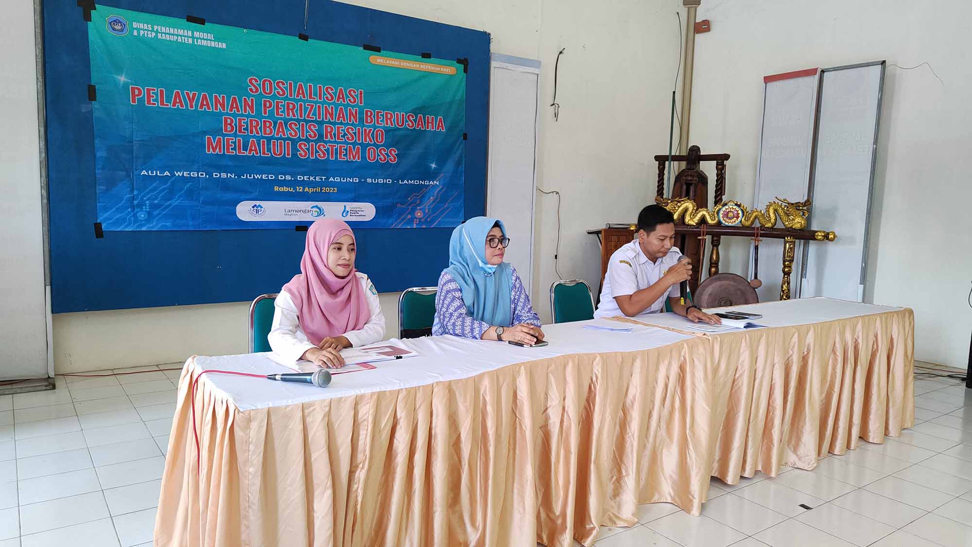 DPMPTSP Kabupaten Lamongan melalui bidang pelayanan perizinan mengadakan kegiatan sosialisasi tentang pelayanan perizinan dengan menggunakan aplikasi OSS (Online Single Submission) bagi para pelaku usaha mikro dan kecil (UMK). Kegiatan ini berlangsung hari Rabu tanggal 12 April 2023 bertempat di Aula Wego - Dsn. Juwed - Ds. Deket Agung - Kec. Sugio Kabupaten Lamongan.